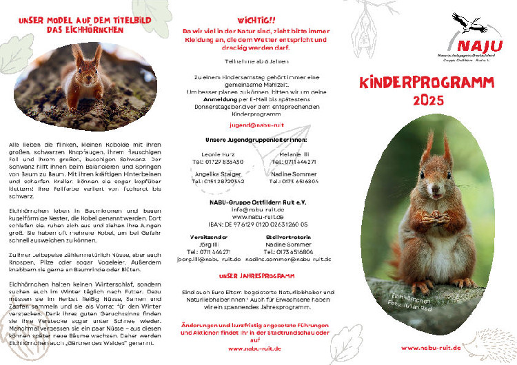 Die Naturschutzjugend des NABU-Ruits trifft sich einmal im Monat zum Kindergruppensamstag (siehe beigefügtes Programm). Der Samstag startet immer um 9.00 Uhr am Vereinsheim im Klebwald. Dort finden sich 15 – 25 Kinder im Alter zwischen 6 und 12 Jahren ein. Wie im Programm zu lesen ist gibt ein Thema aus der Natur, welches genauer unter die Lupe genommen wird. Wir spielen aber auch gemeinsam, lösen Rätsel zum Thema, basteln und bereiten uns gemeinsam ein Mittagessen zu. Um 14 Uhr geht unser Kindersamstag dann zu Ende.