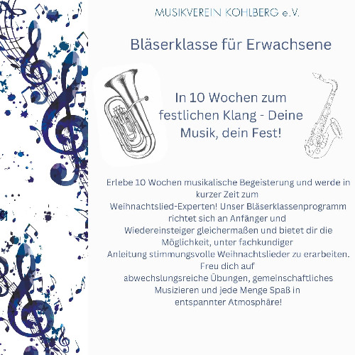 Ein ganz neues Projekt wird nun Erwachsene in nur 10 Wochen an ein Blasinstrument heranführen. Start der Bläserklasse ist der 18.09.2025 und bis Weihnachten sollen erste Weihnachtslieder gespielt werden können. Unter fachkundiger und motivierender Anleitung lernen die Teilnehmer (Anfänger / Wiedereinsteiger) in einer kleinen Gruppe das gewählte Instrument kennen und erste Stücke für das Weihnachtsfest spielen. Es erwarten die Teilnehmer abwechslungsreiche Übungen und gemeinschaftliches Musizieren in einer entspannten Atmosphäre. Am Ende, kurz vor dem Weihnachtsfest, sollen alle dann soweit sein, dass sie nicht nur daheim unterm Christbaum sondern auch gemeinsam in der Gruppe ihr Instrument spielen können.