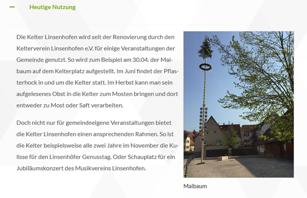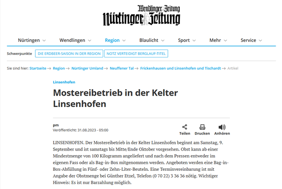 Seit vielen Jahrzenten wird in der historischen Kelter in Linsenhofen Obst aus den umliegenden Streuobstwiesen zu Apfel- und Birnensaft verarbeitet. Jeder Stücklesbesitzer bringt nach Absprache seine eigene Ernte aus den Streubstwiesen in die Kelter und kann unter Mithilfe seinen "eigenen" Saft erzeugen. Dies macht nicht nur den Erwachsenen Spaß, sondern auch Kindern und Familien und trägt nicht nur zum Erhalt der Streuobstwiesen bei, sonder schult gleichzeit den Umgang mit der Natur. Damit nicht nur wie früher Most aus den Säften gewonnen wird, sondern auch konservierter Apfel- oder Birnensaft hergestellt werden kann, hat der Verein für Obst-, Garten-, und Landschaft Linsenhofen e.V. (VOGL) für den herbstlichen Kelterbetrieb eine Bag-in-Box-Anlage angeschafft und stellt seit 2016 der Gemeinde Linsenhofen dies kostenfrei als Ergänzung zur Saftpressung zur Verfügung.