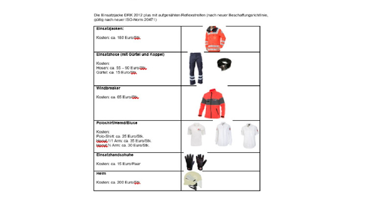 Für neue neue aktive DRK Mitglieder müssen wir neue Einsatzkleidung beschaffen, aufgrund neuer Sicherheitsbestimmungen sind auch einige Teile zu tauschen. Es handelt sich bei den Anschaffungen um die persönliche Schutzausrüstung für die Helferinnen und Helfer im Einsatz bei Sanitätsdiensten. Die Einsattzkleidung eines Helfers, einer Helferin beträgt rund 800,- €. (Einatzjacke, Hose, Gürtel, Windbreaker, T-Shirt, Hemden, Handschuhe, Helm und Sicherheitsstiefel)