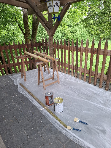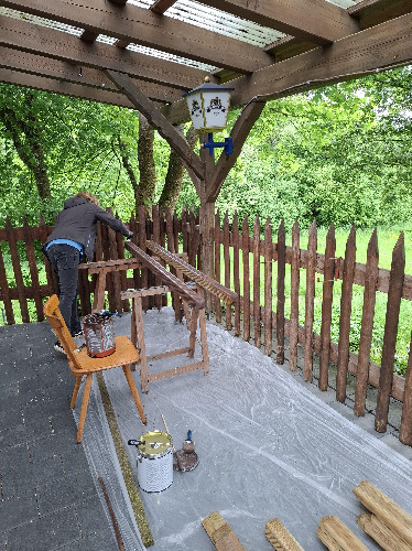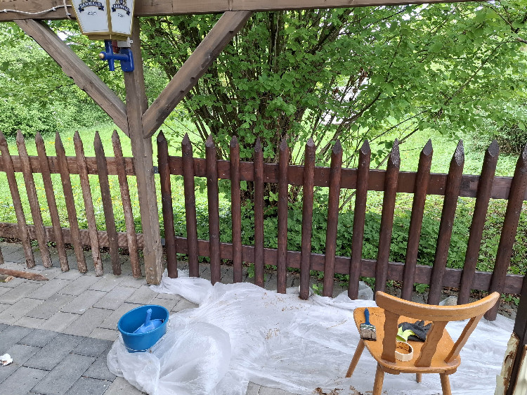 In diesem Jahr steht nun der Außenbereich des Vereinsheims im Fokus. Unsere überdachte Terrasse ist ein zentraler Treffpunkt für Feiern und gemeinsame Stunden – allerdings war der umlaufende Holzzaun in einem stark renovierungsbedürftigen Zustand: Zahlreiche Latten waren beschädigt oder fehlten ganz, die Pfosten waren locker, der Zaun verzogen und der Anstrich verwittert.