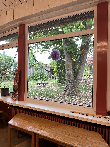 Deshalb möchten wir für die Kinder in unserer zentralen Halle an einem großen Fenster ein Sitzfenster einbauen. Als "Ruheinsel" soll es für die Kinder eine Möglichkeit bieten, sich zurückzuziehen. Die Kinder können dann über eine Treppe mit Haltegriffen aufsteigen und es sich auf der verbreiterten Fensterbank auf Kissen gemütlich machen. Dort haben sie die Sicht in unseren wunderschönen, naturnahen Garten. Durch das Sitzfenster haben die Kinder die Möglichkeit: die Natur, die Jahreszeiten, unsere Eichhörnchen, Vögel und das Wetter zu beobachten.