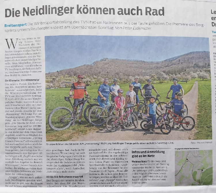 Beim TV Neidlingen wurde im Frühjahr 2025 eine neue Unterabteilung der Skiabteilung gegründet um die Mitglieder aufgrund der schlechten Winter auch im Sommer an den Verein zu binden und Kindern die Möglichkeit zu bieten sich mit dem Verein zu identifizieren ohne Rücksicht auf Witterung. Aus diesem Grund wurde ein wöchentliches Radtraining installiert und auch schon ein Radrennen ausgeführt: Bergsprint um den Reußenstein. Damit die Kinder das Fahrrad beherrschen lernen um danach im Gelände trainieren zu können wollen wir verschiedene Rampen u. Steilwandkurven anschaffen oder auch zum Teil selbst bauen. Es soll ein Geschicklichkeitsparcour entstehen bei dem auch bereits die Kleinsten mit dem Laufrad das Gleichgewicht und den Umgang mit dem Fahrrad/Laufrad üben können, damit im Gelände später das Fahrrad gut beherrscht wird.