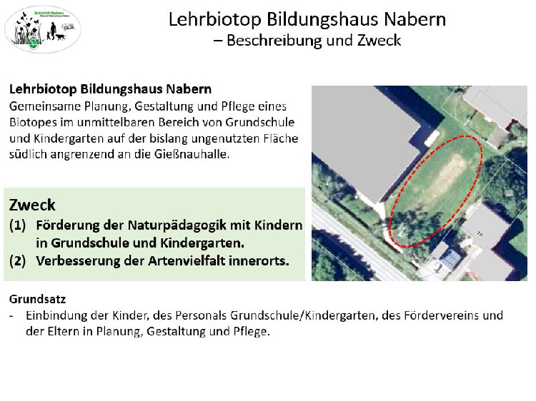 Das Projekt umfasst die Planung, Gestaltung, Nutzung und Pflege einer Biotopfläche im unmittelbaren Bereich von Grundschule und Kindergarten auf einer bislang ungenutzten Fläche an der Gießnauhalle.