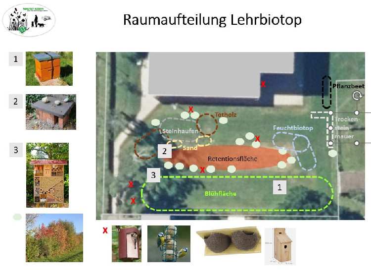 Beginnend im März 2025 wird die Biotopfläche in zwei Jahren durch die Anlage von verschiedenen Habitaten gestaltet. Sie werden als Einzelprojekte unter Leitung des Teams Natürlich Nabern und jeweils maximaler Einbindung der Kinder, den Erzieherinnen /Pädagoginnen und von Eltern angelegt.